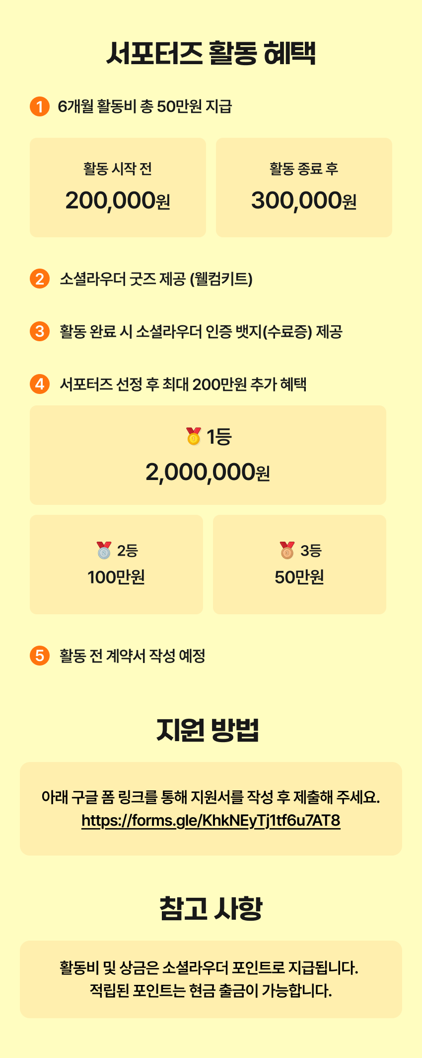 - 우수 서포터즈 추가 혜택 (1등 200만원 / 2등 100만원 / 3등 50만원)